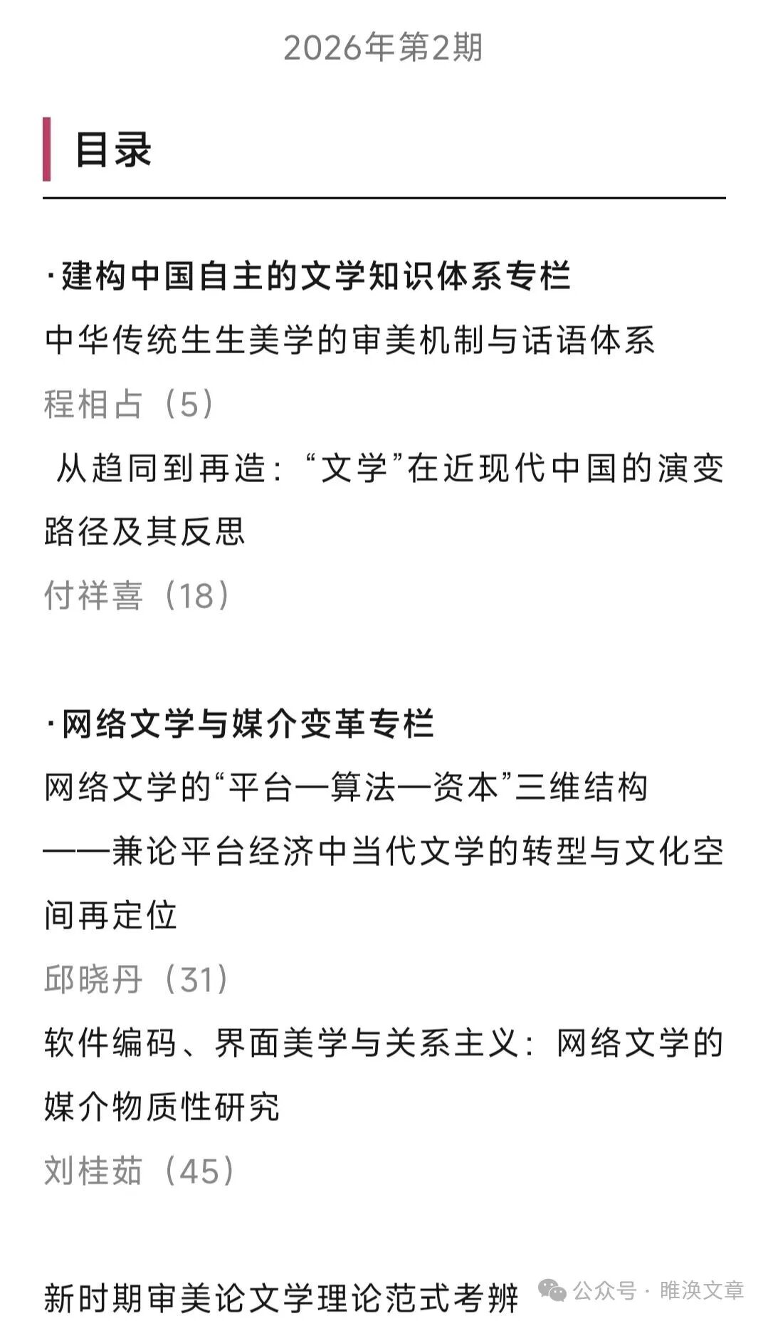 文艺理论研究|《文艺理论研究》2026年第1期目录、摘要