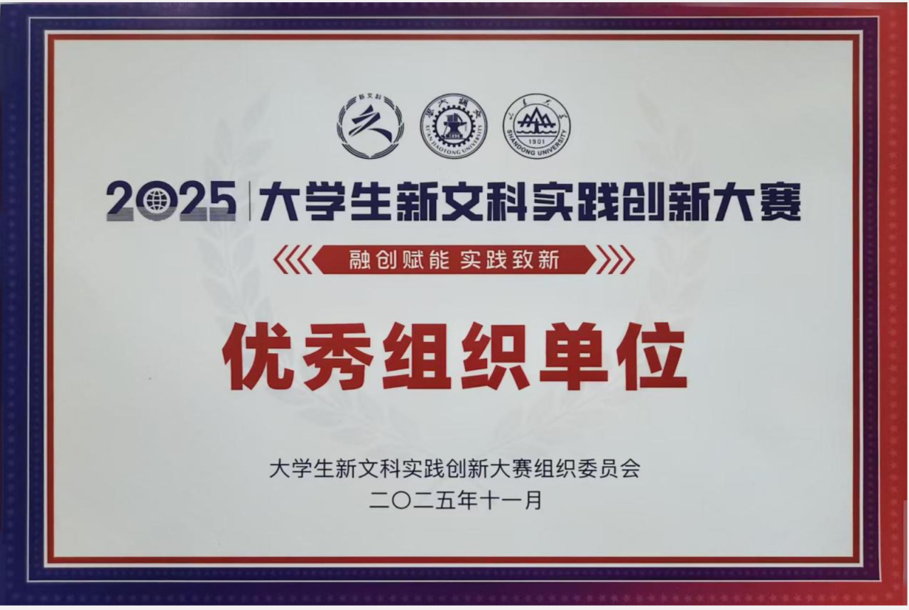 11月28日—30日,由全国新文科教育研究中心主办,山东大学、西安交通大学联合承办的2025年大学生新文科实践创新大赛在西安交通大学举行,大赛以“融创赋能 实践致新”为主题。文学院2项学生项目入围决赛并均获银奖。大学生新文科实践创新大赛组织委员会授予我校“优秀组织单位”荣誉称号。