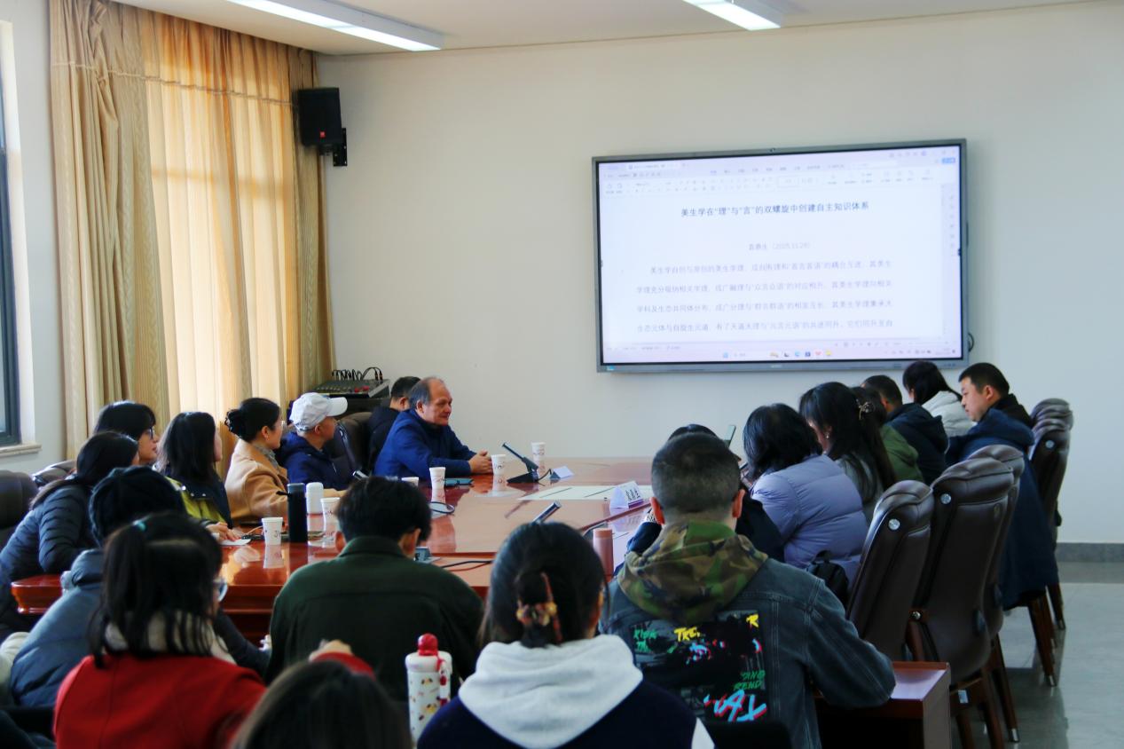 为深入推进美学学科建设,夯实学科发展根基,2025年11月29日,文学院特邀享受国务院政府特殊津贴专家、生态美学研究领军人物、广西优秀专家、广西民族大学袁鼎生教授开展题为“美生学:理-言双螺旋的自主知识体系”的专题讲座,讲座由文学院徐俊六副院长主持,文学院师生积极参与。